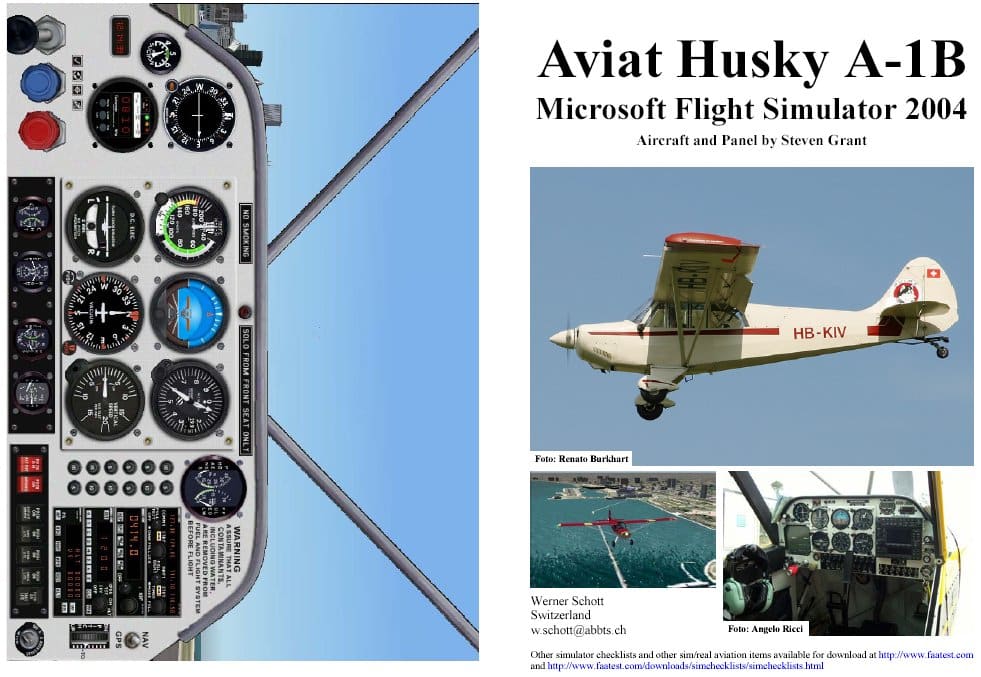 FS2004 Manual/Checklist Aviat Husky A-1B. In PDF-format as a booklet. From “cold” – Pre Start – Startup – Before Taxi – Taxi – Before Takeoff – Takeoff – Climb Out – Cruise – Descent – Approach – Landing – Taxi To Ramp – Shutdown – Securing Aircraft – to “cold”. Based on the “Aviat Husky A-1B” aircraft and panel by Steven Grant. Freeware by Werner Schott. 1MB