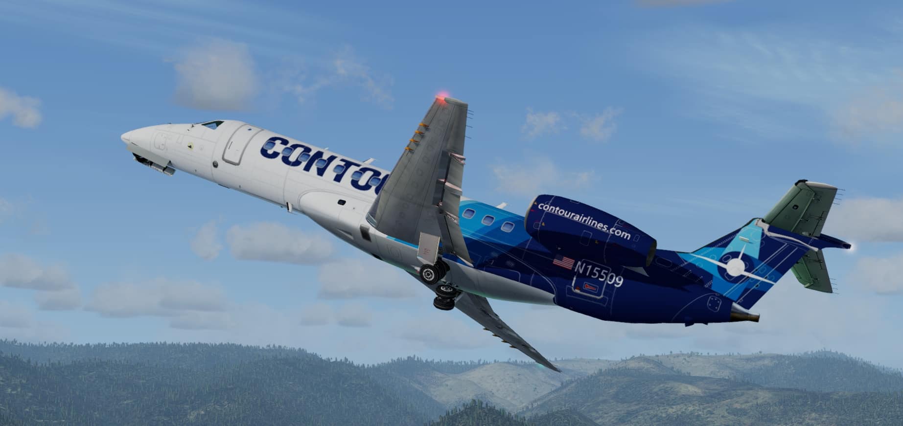 FSX/P3D Embraer ERJ-135 FSX Native Package, Contour Aviation/Contour Airlines. Contour Aviation is a US charter airline based at Smyrna Airport, Tennessee and currently have 30 ERJ-130. Project Opensky Embraer ERJ-135 FSX native model and VC. Models: Exteriors by Project Opensky. VC Models by Jacob Kubique and Corey Ford of Project Opensky. XML Coded Animations by Hiroshi Igami of Project Opensky. FSX and Prepar3D (tested up to v5) 2020 conversions by Speedbird77. Textured by Chris Evans
