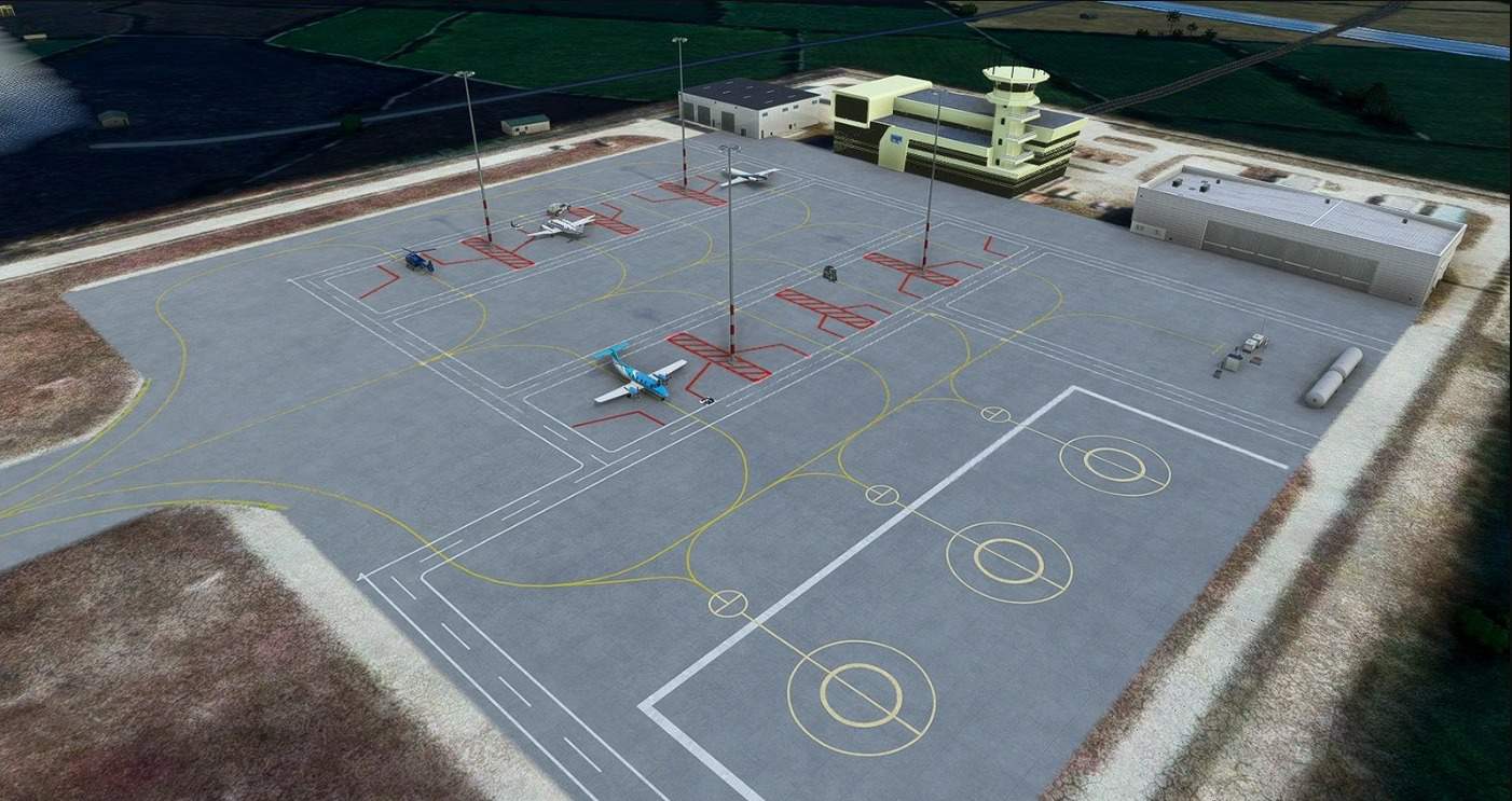 In spite of being a GA Airport, it is built to the standard of an airport which is capable of handling airline traffics, with night landing facilities and probably instrument procedures. An arbitrary tower frequency and a very simple RNAV approach from calculations are implemented.