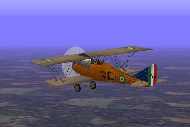 The Ansaldo S.V.A. 5 was a sturdy two-seater reconnaissance aeroplane used on this and other duties, in service in the Aeronautica Militare Italiana during WWI. This plane, decorated with the “Dares Greater” constellation on his tail and flown by Italian poet Gabriele D’Annunzio and his pilot Captain Natale Palli, lead the squadron “La Serenissima” on August 9, 1918, over Vienna. In their literary raid of Vienna, D’Annunzio and his mates, dropped leaflets containing the poet’s writings, about the austrian defeat by the italian forces, and flew more than 620 miles, almost 500 over enemy territory. FS98 Aircraft Designer: Angelo Moneta Reworked BMP textures, moving parts and DP for CFS: Edmundo Abad Dec. 2010