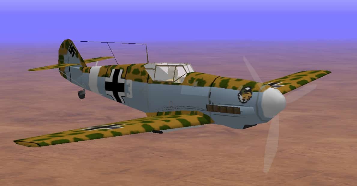 Messerschmitt bf 109 E-4 Trop of JG27, North Africa, 1941-42. This virtual model is up-scaled (8) to obtain a better view in Combat Flight Simulator. Original design by Richard Osborne/Corrado La Posta – IS4G collection. Desert textures by Edmundo Abad, 2010.