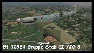 Bf 109E-4 Gruppe Stab II./JG 3 Adjudant Battle of Britain summer 1940 Paintscheme in RLM 71/02/65 markings in RLM 21. FS AEROPLANE HEAVEN Bf 109E Mk 2.1 REPAINTS for CFS 3 by the Bill Wilson and Foute Man Original plane by Aeroplane Heaven stand alone version flight dynamics by Bill “Spitfrnd” Wilson repaint & hex editing by the Foute Man filename: fs_bf109e_38v2-1.zip To fly this plane you need to have the fm_bf109e_shared files installed . 2MB