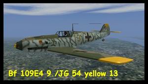 CFS3 Bf 109E-4 9./JG 54 yellow 13 Battle of Britain summer 1940 Paintscheme. FS AEROPLANE HEAVEN Bf 109E Mk 2.1 REPAINTS for CFS 3 by the Bill Wilson and Foute Man in RLM 71/02/65 Original plane by Aeroplane Heaven stand alone version flight dynamics by Bill “Spitfrnd” Wilson repaint & hex editing by the Foute Man filename: fs_bf109e_50v2-1.zip To fly this plane you need to have the fm_bf109e_shared files installed. 2MB