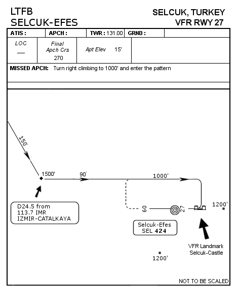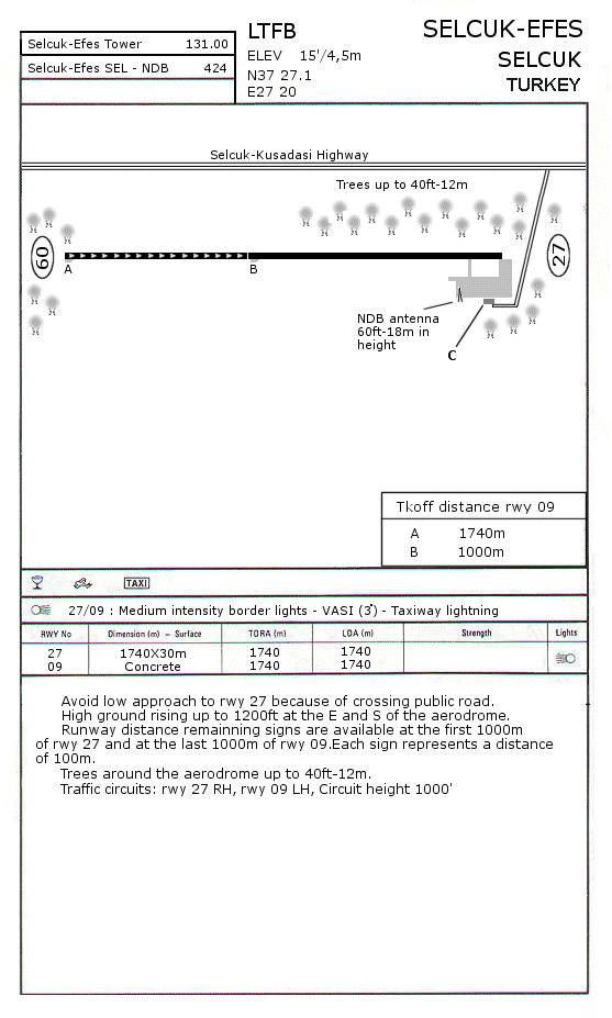 FS2000 Selcuk-Efes Aerodrome LTFB (Turkey) Highly detailed and accurate scenery of the aerodrome based on real charts and my own experiences.The aerodrome has a 1740m concrete runway which is lighted for night operations.Includes custom textures and 3D objects as well as some static aircraft and the VFR landmarks.Exclude switch is created as a scenery file so you don’t have to make any changes in your own scenery.cfg file.Aerodrome charts are also included in this package. By Baris Unal. 1.1MB