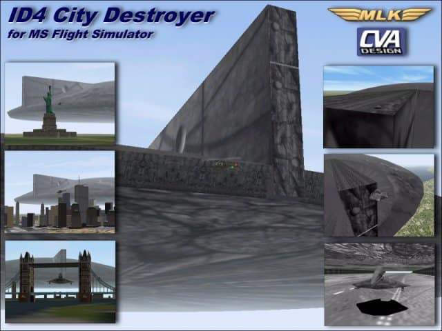 FS2000/CFS2 Scenery – ID4 City Destroyer You could have seen this extra-terrestrial ship in the sci-fi movie “Independence day”. Its diameter is impressive 16 miles ( 25km ). Destroyers in this scenery are above 4 areas: New York, London, Prague and Midway. Special features: there are two airports on each ship. You can perform take-off or landing on Destroyer’s tower roof or in its “beehive” By Milan Lisner and Vlada Stoje (CVA Design). 940K