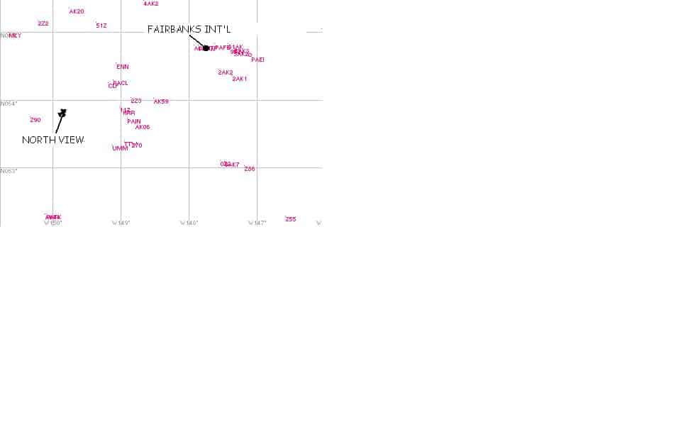 North View, Alaska. North View is located 75 miles from Fairbanks on a 226 degree heading. It has a 2400 foot gravel runway and is open all year long. This location is for wheeled planes only, there is no lake. There will be a floatplane scenery not too far from here soon. There are two cabins there for your useage and the wildlife is in abundance. Have fun and enjoy the scenery!! Scenery By Don Moser / Alaska By Don. 581K