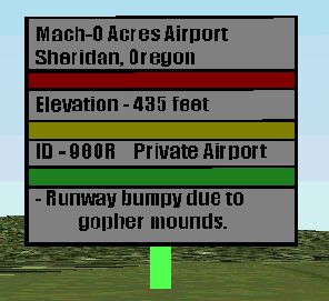 Oregon Signs for FS2000. This program places airport signage at 313 airports in Oregon state. It was written for Flight Simulator 2000 and includes the name of the airport, town, elevation, ATIS, and ILS. In additon, many airports have remarks at the bottom of the sign, such as “Coyotes and dogs may dig holes in runway”, “Do not land during high tide”, “Gopher mounds on runway”. These comments were taken from the FAA master record for each airport and make for interesting reading after you land. Signs also rotate. Hope you enjoy them. Please open orsign2k.txt file for installation instructions. John Blahm. 1MB