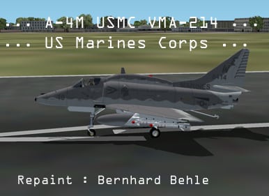 A-4M USMC US Marines Corps VMA-214 This Repaint is based on Denis daSilva-Oliveira’s famous A4/TA4 repective FA-1/FA-1A Project. Full Aircraft …. for Panel & Sound A4Q.zip is required… Model/FlightDyn. by Denis daSilva-O. Repaint by Bernhard Behle … June 2002. 3.6MB