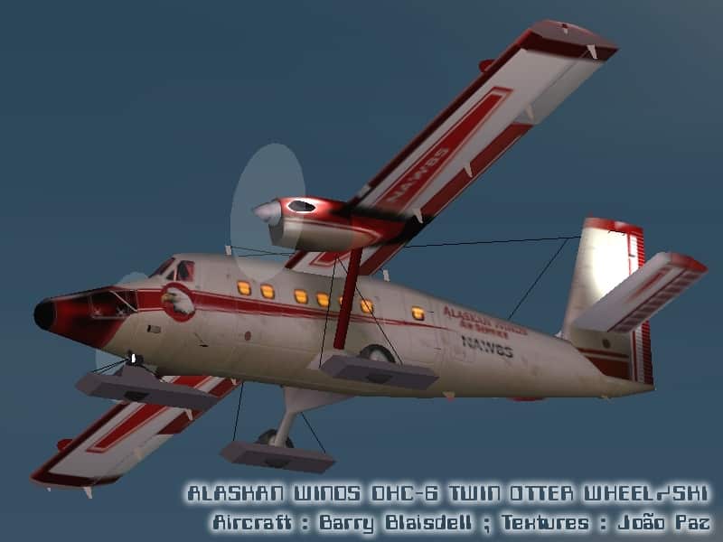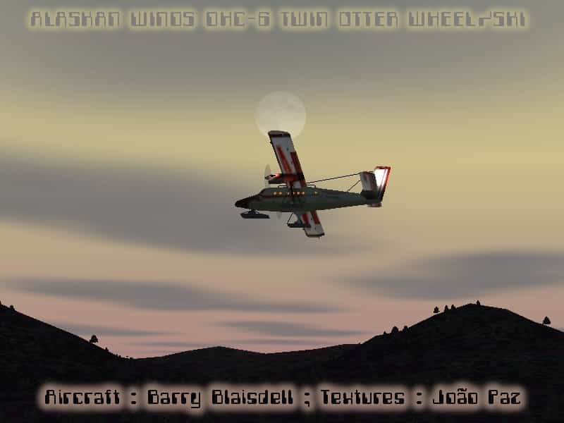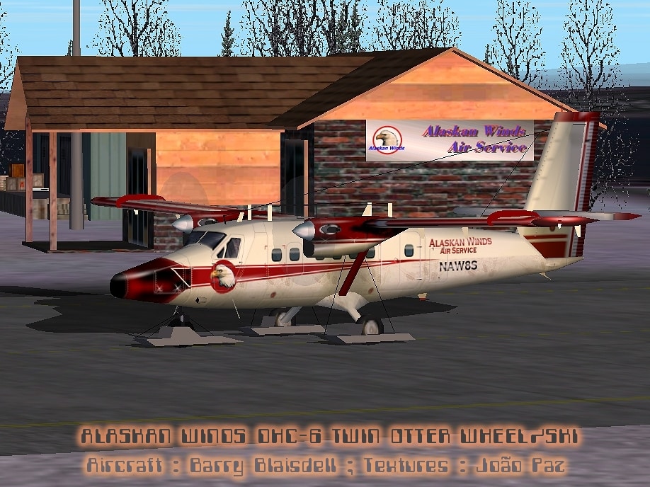 Alaskan Winds Air Service FS2002 PRO De Havilland Canada DHC6-300 Twin Otter in Skis (STOL turboprop regional airliner and utility transport) Sea version Alaskan Winds livery and night lighting textures by Joao Paz, March 2002| Alaskan Winds Air Service operates a charter service throughout | | the Great State of Alaska, and aims to honor the incredible | | array of brave pilots whom, in their fragile birds, | | made Alaska possible in its early American years. Aircraft, original livery & docs By Barry Blaisdell. 3.5MB