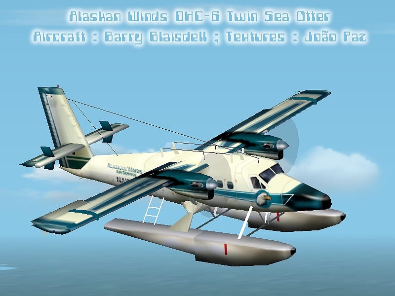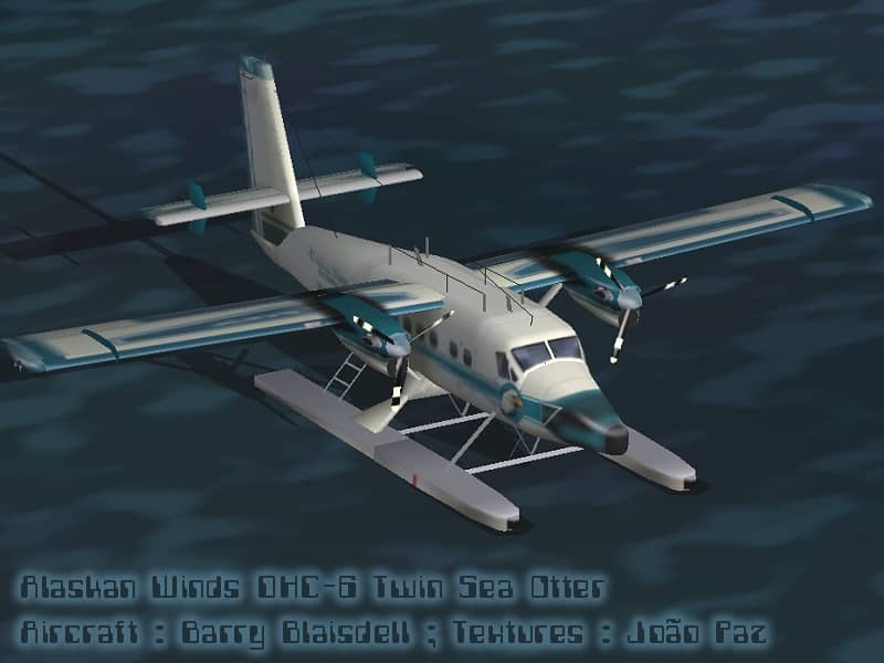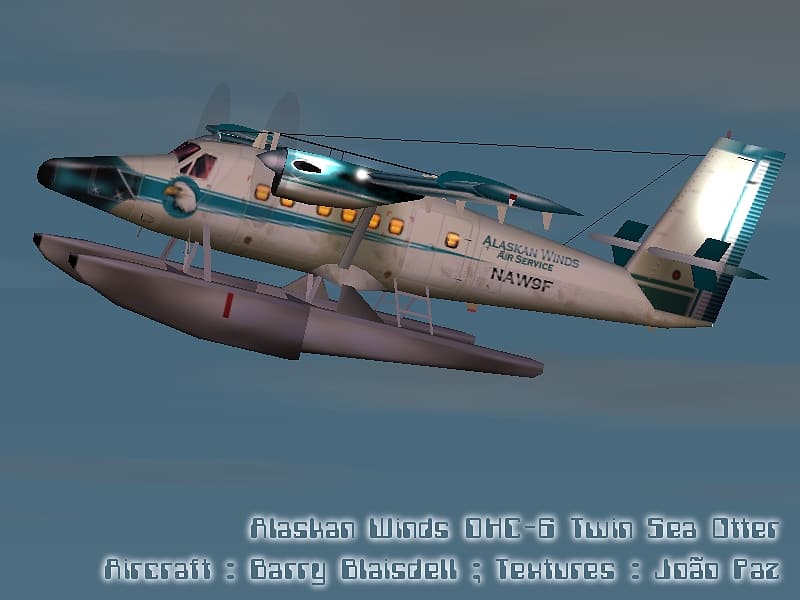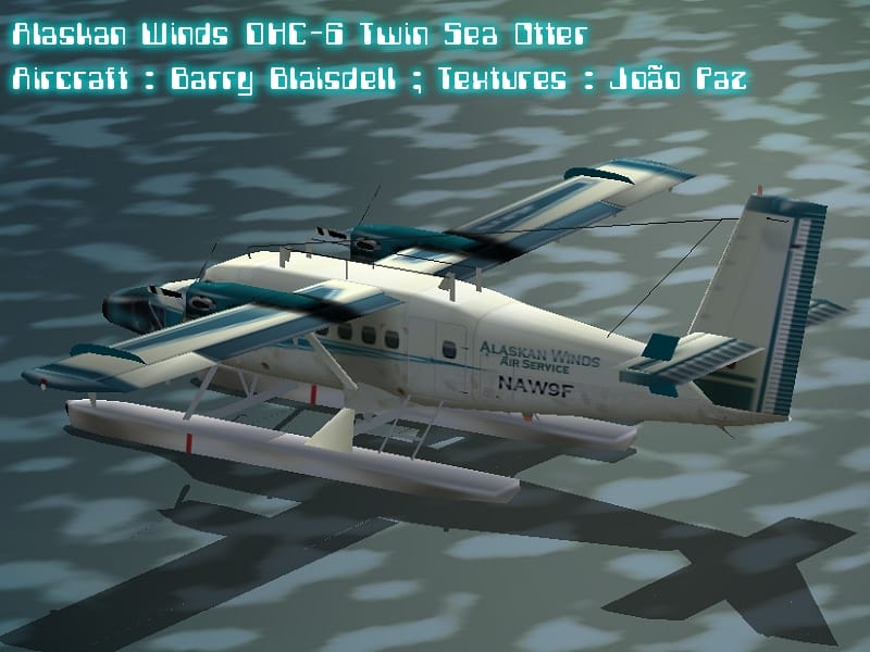 Alaskan Winds Air Service | | FS2002 PRO De Havilland Canada DHC6-300 Twin Sea Otter | | (STOL turboprop regional airliner and utility transport)Sea version Alaskan Winds livery and night lighting textures by Joao Paz, March 2002Alaskan Winds Air Service operates a charter service throughout the Great State of Alaska, and aims to honor the incredible | | array of brave pilots whom, in their fragile birds, | | made Alaska possible in its early American years.Aircraft, original livery & docs By Barry Blaisdell. 3.6MB