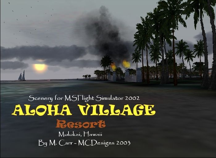 Aloha Village in Molokai, Hawaii. Highly detailed scenery with CUSTOM ground textures, bungalows, tropical flora, and lots of people. Featuring additions to the Molokai airport, a paved runway for arriving tourists, helicopter landing zone, tiki torches, a lighted swimming pool, gift shops, private bungalows, loading docks for incoming supplies, lighted boat docks, a private beach for tourists and a nightly fireworks display at 9 sharp. Requires Gerrish Grey’s Tree library. (here if needed) Michael Carr. 6.1MB