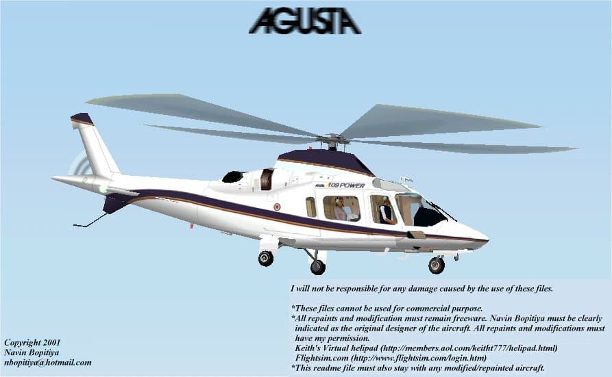 FS 2000/2002 Panel Agusta 109 E Power Twin Engine Helicopter Panel for Agusta A109E Power Demo using most default Gauges. Includes a Garmin 195 GPS Gauge. Specialy designed for Navin Bopityas A109demo and other Executive-Helicopters. By Peter Salzgeber. 551K