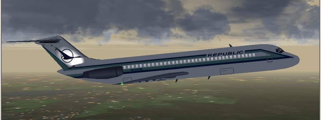 FS2000/2002 Republic DC-9-32 This is a DC-9-32 series passenger jet in the paintscheme of Republic from the 1980s’. Features fully animated control surfaces and landing gear with complete textures for night lighting. Original model Mauricio Vanscoit. Republic paint by Gary D.Jones. 930K