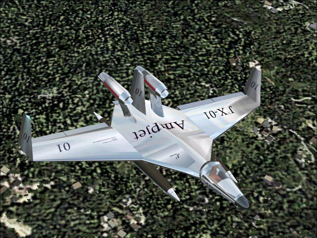 FS2002 Aircraft Ampjet Amphibious Jet Beta By John Fay Beta version of a new style Amphibious jet. This release is to gain user feedback for improvemants. Look in Readme for contact info. Features include a fully functional DVC, all moving control surfaces, Working reverse thrusters, visible heat exhaust,working gear suspension, opening passenger and cargo doors,rolling wheels,stearable nose wheel, working water rudders, plus much more. 2002 John Fay. 5.6MB