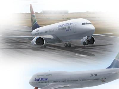 FS2002 B747-400 and B737-400 South African Airways Default Repaints and splash screens. Includes Textures only for the B747-400 and B737-400 stock aircraft and 4 FS2004 splash screens. By C Trew and W Wright. 2MB