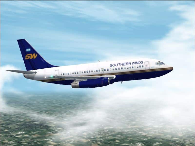 FS2002 Boeing 737-287 Advanced Southern Winds. Features full moving parts, flaps and slats, spoilers, rolling wheels with steerable nose gear. Enhanced FS2002 lights : beacons, un-synchronised strobes, working landing lights. High resolution day and night textures, transparent flight deck windows with 3D crew, 3D compressor blades, working thrust reversers work in FS2000, JT8 jet smoke system for FS2002. Original model by Terry Gaff. Enhanced flight model, new .air file and repaint by Marcelo Allende. 2.8MB