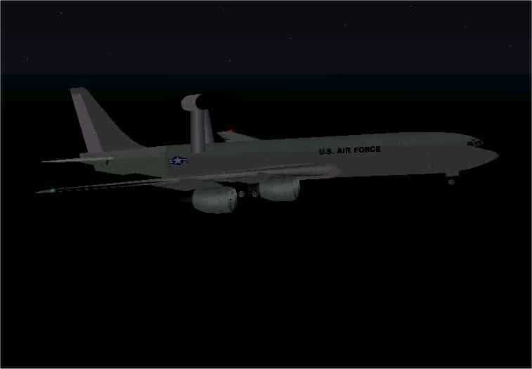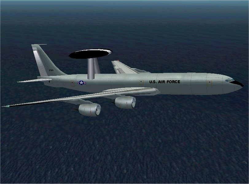 FS2002 BOEING E-3 AWACS-CFM Engines US Air Force E-3 Sentry Military version of the Boeing 707-320.\nOne of the most vital roles fulfilled by the Model 707 airframe is that of the USAF’s and NATO’s Airborne Warning and Control System(AWACS) aircraft. Fully animated model, includes rotating radar dome, clear glass with pilot figures, night textures, nose wheel strng, and sound file created by Erick Cantu. Visual model: Erick Cantu and Rey Lopez, paint and flight dynamics by Rey Lopez. 5.7MB