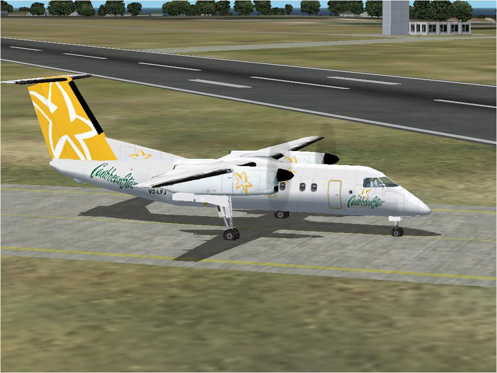 FS2002 Caribbean Star DHC8-100 V2-LFJ Textures Only.Caribbean Star is based at V.C. Bird Intl on Antigua. and operates around the Leeward Islands and down the caribbean to Georgetown Guyana. Repainted by Sean Marlin. 1.3MB