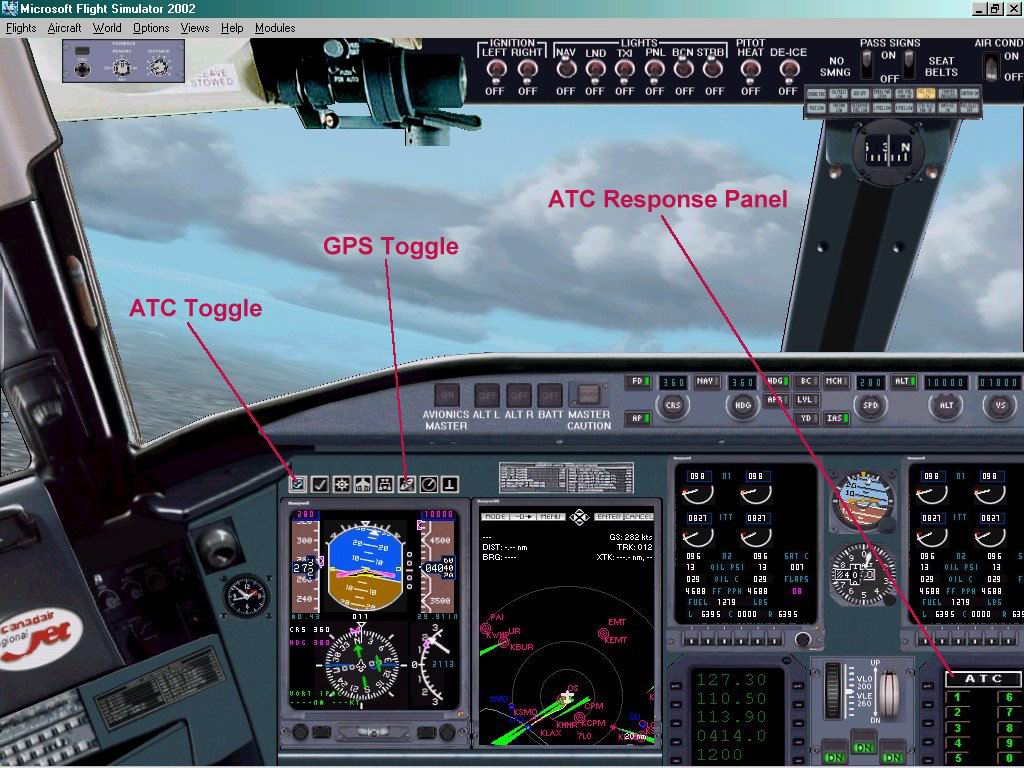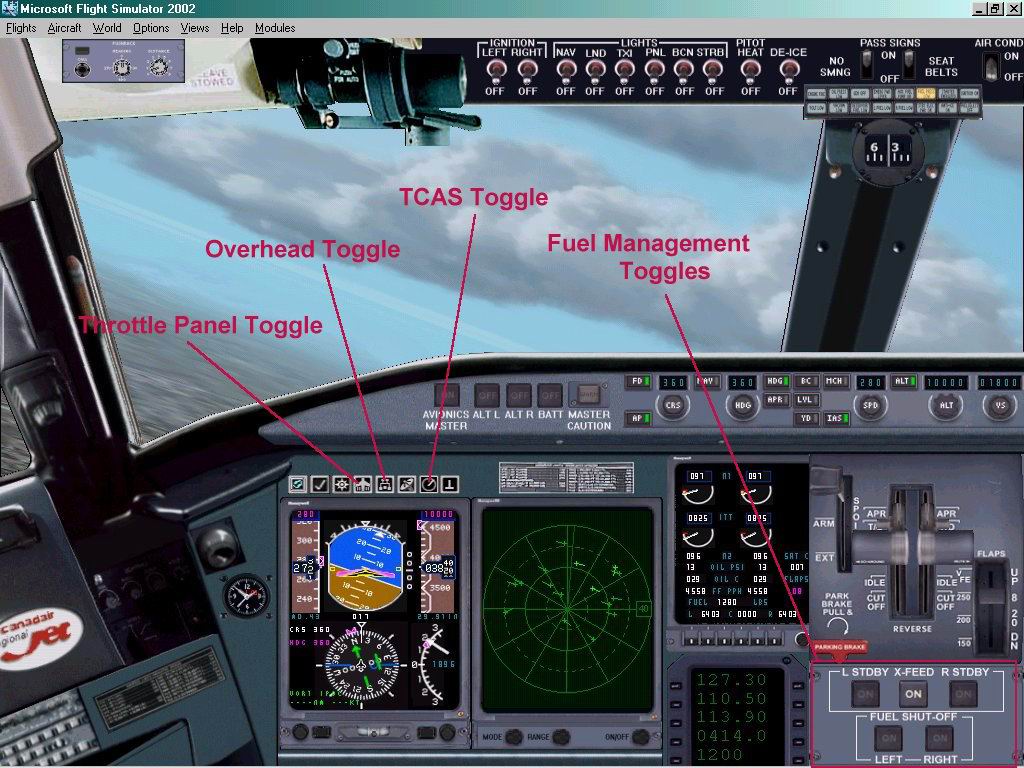 FS2002 CRJ-200 Panel (Optimized for POSKY’s CRJ) This panel was created to compliment and maintain compatibility with the new POSKY CRJ VC. Included are Eric Marciano’s radar gauge, Jorge Salas’ switches and toggles, a few files from the FPDA folks and Christian Koegler, Bill Morad’s ATC panel, and an assembly of HUD gauges from Paul Golding. This panel also uses FS2002 default gauges. By: Leon Seale. 1.9MB