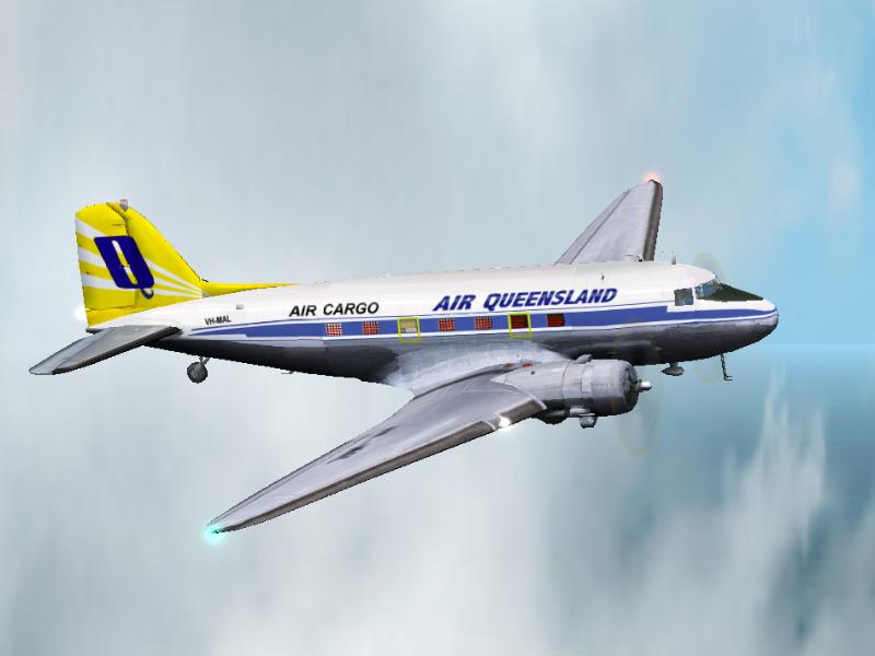 FS2002 Douglas DC-3 Air Queensland Air Cargo VH-MAL A DC-3 in the colours of Air Queensland Air Cargo, registration VH-MAL, in her last livery for that line before her return to Cathay Pacific as “Betsy”. Based on Jan Visser’s legendary DC-3 model for FS2000, updated for FS2002, this model includes transparent cabin windows, nightlighting, lit 3D interior with opening cargo doors, boarding ladder, cargo both inside and outside the aircraft and other details. Includes FS2002 lights fix by Paul Pridmore. Default panel and sound. Repaint by Mark Beaumont. File name: DC3AQAC.ZIP. 2.9MB
