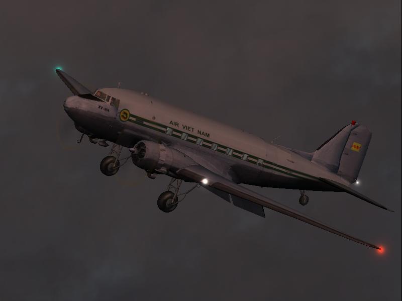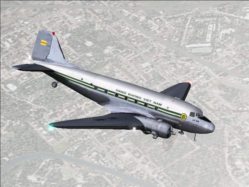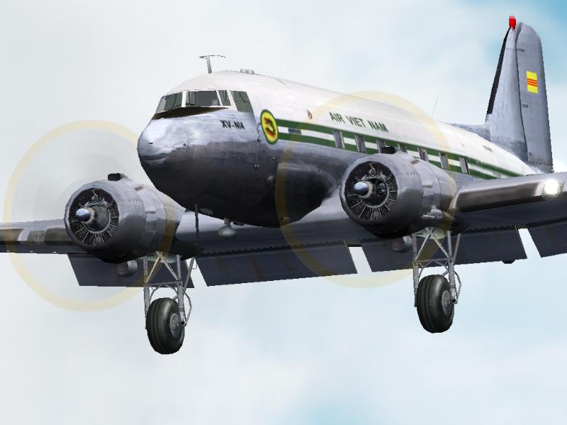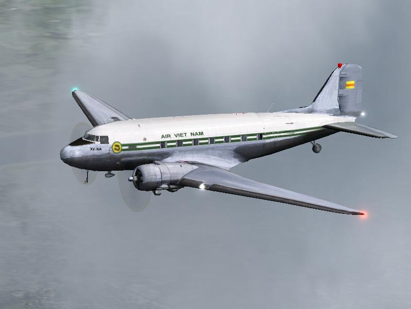 FS2002 Douglas DC-3 Air Viet Nam XV-NIA This DC-3 is painted from photographs taken by Mel Lawrence in 1961. Based on Jan Visser’s legendary DC-3 model for FS2000, updated for FS2002, this model includes transparent cabin windows, nightlighting, lit 3D interior with opening passenger door, boarding ladder and other details. Includes FS2002 lights fix by Paul Pridwales. Default panel and sound. Repaint by Mark Beaumont. File name: DC3VIET.ZIP. 2.8MB see update below