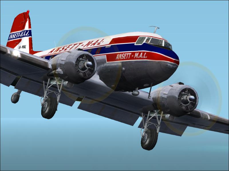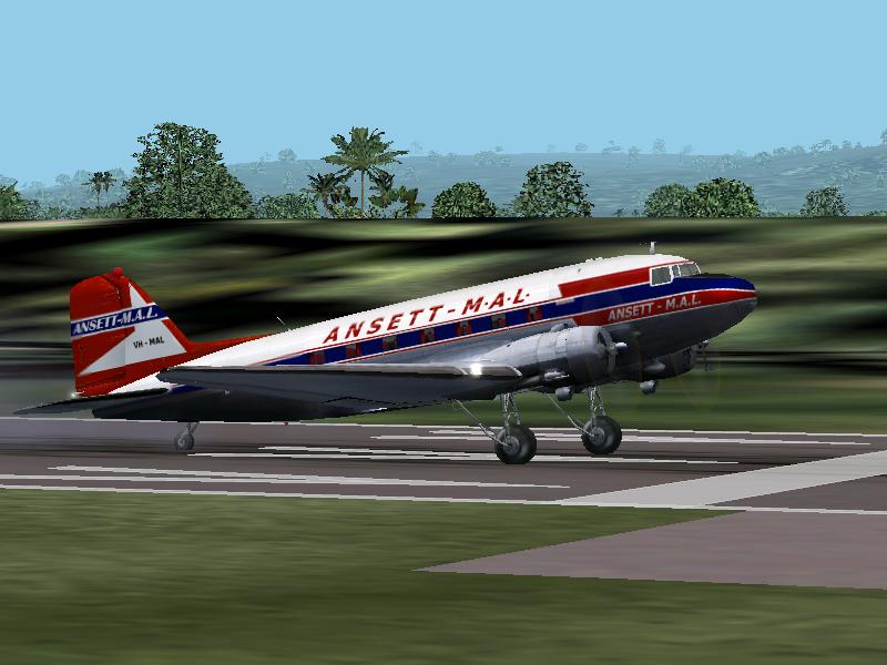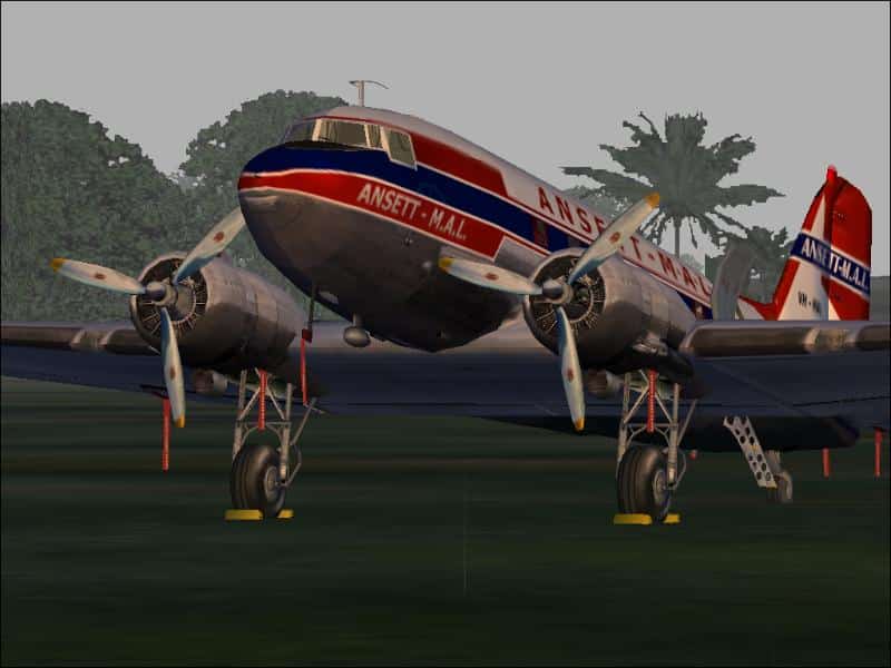 FS2002 Douglas DC-3 Ansett MAL VH-MAL A DC-3 in the colours of Ansett M.A.L. (Mandated Air Lines) of Papua New Guinea, registration VH-MAL, in livery 1963-1970. This aircraft was previously “Betsy”, the founding aircraft of Cathay Pacific Airways. Based on Jan Visser’s legendary DC-3 model for FS2000, updated for FS2002, this model includes transparent cabin windows, nightlighting, lit 3D interior with opening passenger door, boarding ladder and other details. Includes FS2002 lights fix by Paul Pridwales. Default panel and sound. Repaint by Mark Beaumont. File name: DC3ANSOC.ZIP. 2.8MB