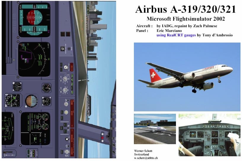 FS2002 Manual/Checklist — Airbus A-319/320/321. FS2002 Manual/Checklist Airbus A-319/320/321. In PDF-format as a booklet. From “cold” – Pre Start – Startup – Before Taxi – Taxi – Before Takeoff – Takeoff – Climb Out – Cruise – Descent – Approach – Landing – Taxi To Ramp – Shutdown – Securing Aircraft – to “cold”. Based on the panel by Eric Marciano, using RealCRT gauges by Tony d’Ambrosio. Freeware by Werner Schott, Switzerland. 1.7MB