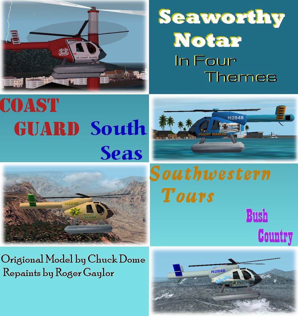 FS2002 MD 520 repainetd Amphibious Helicopter. An FSDS aircraft with moving parts and a dynamic virtual cockpit. It is a true amphibian in FS02. Origional Model by Chuck Dome. Four Repaints enclosed. Corast Guard, South Seas Tour, Southwestern Tours & Coast Guard By R. Gaylor. 1.8MB