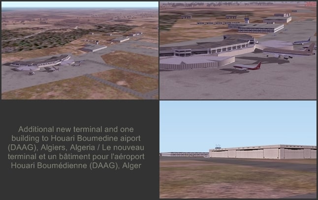 That scenery is adding the recent terminal built there to the FS2002 default scenery for the Houari Boumediene Airport (DAAG), Algiers, Algeria. Albeit non realistic that file is adding some more, useful realism to the DAAG airport. Also a building added to the East of the old terminal is of use
