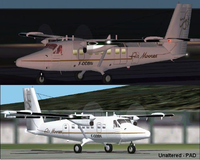 FS2002 PRO deHavilland DHC6 Twin Otter Air Moorea (French Polynesia) F-ODBN This aircraft flies the Air Shuttle between Papeete and Moorea about 12 times per day. The flight takes just 6 minutes. A/C Design : Barry Blaisdell Flight Dynamics: Steve Small Air Moorea Paint: Bob May Premier Aircraft Design. 320K
