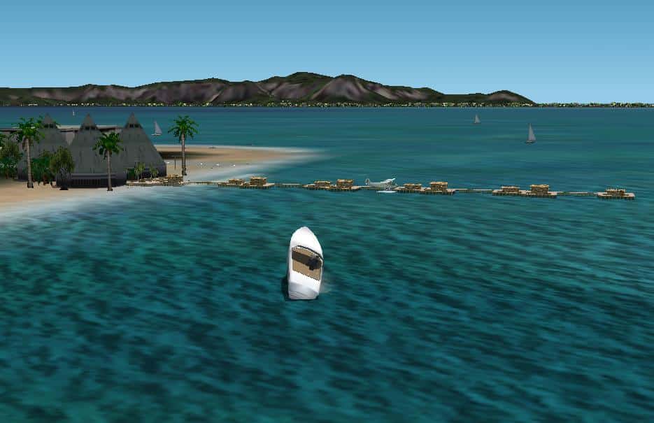 FS2002, Raiatea Airport, Island of Raiatea, French Polynesia——Uturoa, NTTR By Bill Melichar This scenery adds a new more realistic primitive style terminal, a new hangar area, and adds a dock and terminal for sea planes at the Raiatea airport. Raiatea is one of the major airports of French Polynesia, and is located in the Society Islands where most of the population and tourist industry exist. It has one of the longest runways of the outer islands at 5,400 feet. The other part of this island named Tahaa can be seen sitting out across the beautiful coral bay. 1.6MB