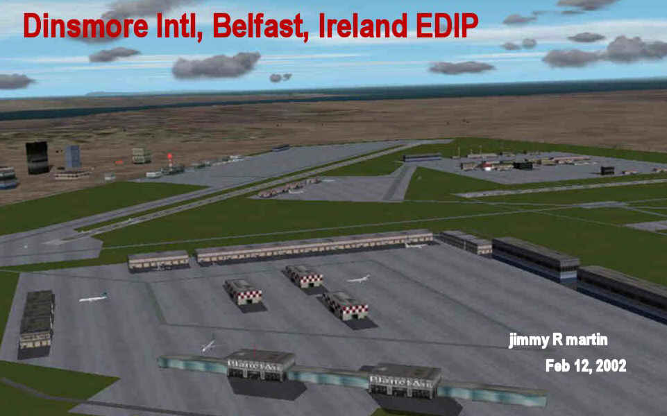 FS2002 Scenery (fictional) – Dinsmore Intl, Northern Ireland (EDIP). This virtual airport is massive covering some 10 square miles of area. Has the following features: RUNWAYS: Active aircraft uses main runway 36R. Full ILS and approach lighting. Different approach lighting depending on runway size. 5 runways: Two 11,000′ one 8,500′ all three having taxi ways to the main terminal area, main cargo area, PlanetAir terminal & cargo area and airline maintenance area. Jimmy R Martin. 1.3MB Airport Map. 62K