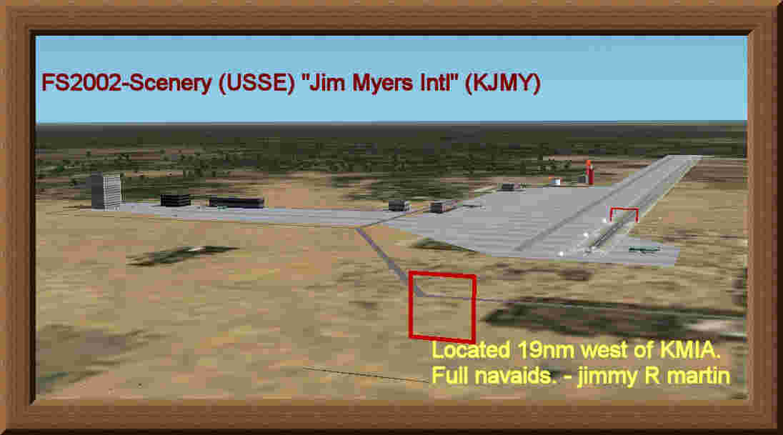 FS2002 Scenery (USSE) Jim Myers International, Florida KJMY Located 19nm west of KMIA. Active airliner uses runway. Watch our for KMIA traffic! Full ILS and navaids. Dedicated to Jim Myers for his encouragement from Florida. Created with Airport 2.60V133 & Abacus FSSDA. jimmy R martin. 56K