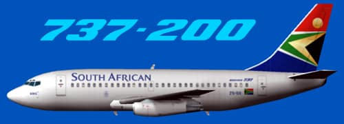 FS2002 South African Boeing 737-200. A 737-200 from AI Aardvark designed especially for AI traffic. Features 6 LOD models and moving parts. Very detailed, includes animated gear, flaps & spoilers, thrust reversers, antennas, flap canoes and simulated gear bays and specular highlights. Extremely frame rate friendly. Includes optional reflective model. Model by David Rawlins. Paint by Daniel DiBacco. FDE by David Carter. 603K