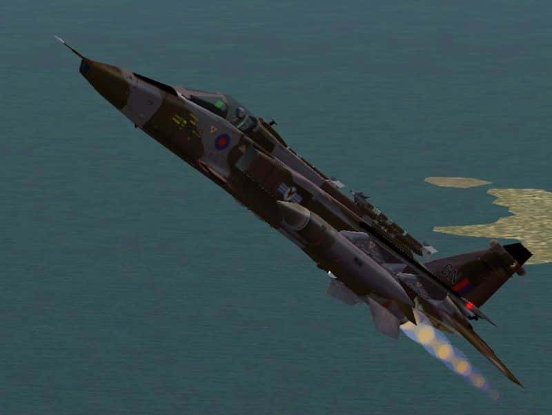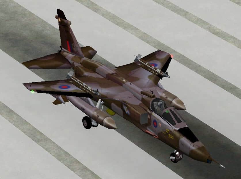Jaguar GR1 of 20 Sqn RAF Laarbruch,Germany. REPAINT BY PAUL HEATON 04/07/2002 Model has animated spoilerons, differential slab tailplane, Flaps and slats, airbrakes and undercarriage. Also rotating wheels with nose wheel steering. Additional effects include brake chute deployment on landing, reheat effects and pilot. Updated texture placement and model with greater detail such as aerials and blisters. Produced using Abacus FSDS, SDLEdit and Abacus Aircraft Animator. Model and texture by Tyler Gladman, Original Air file by Keith Clifford, Reheat effects by Oxyd. 4.8MB