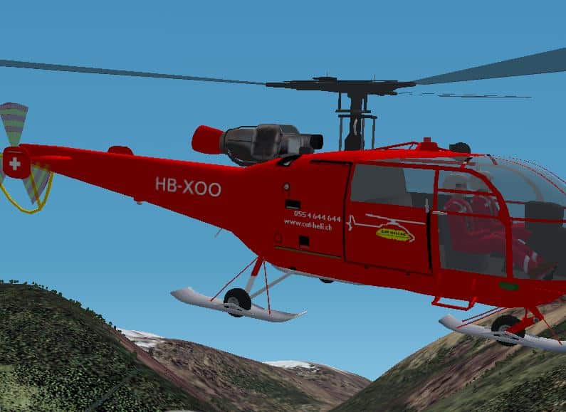 SA.319B Alouette III. Commercial Transport Helicopter (CAT Heli) Textures only. Requires Alouette Rega on previous page. AG, Reichenburg, Switzerland, HB-XOO. Original Aircraft by Wolfgang Kulhanek Repaint by Pascal Küffer. 423K