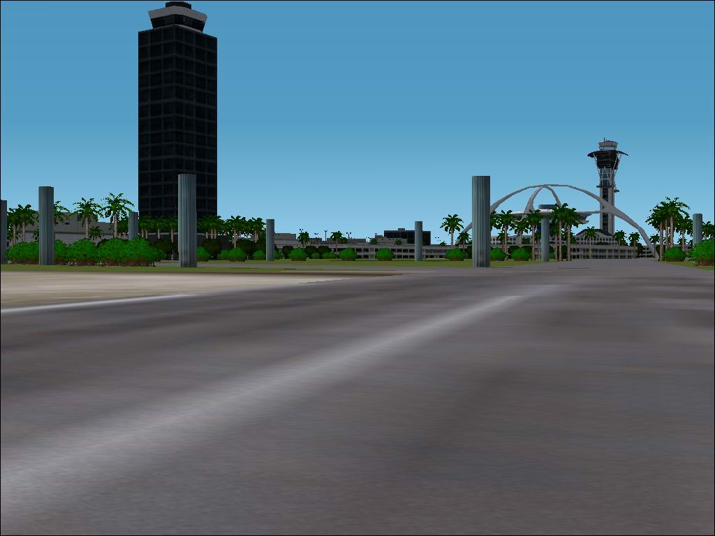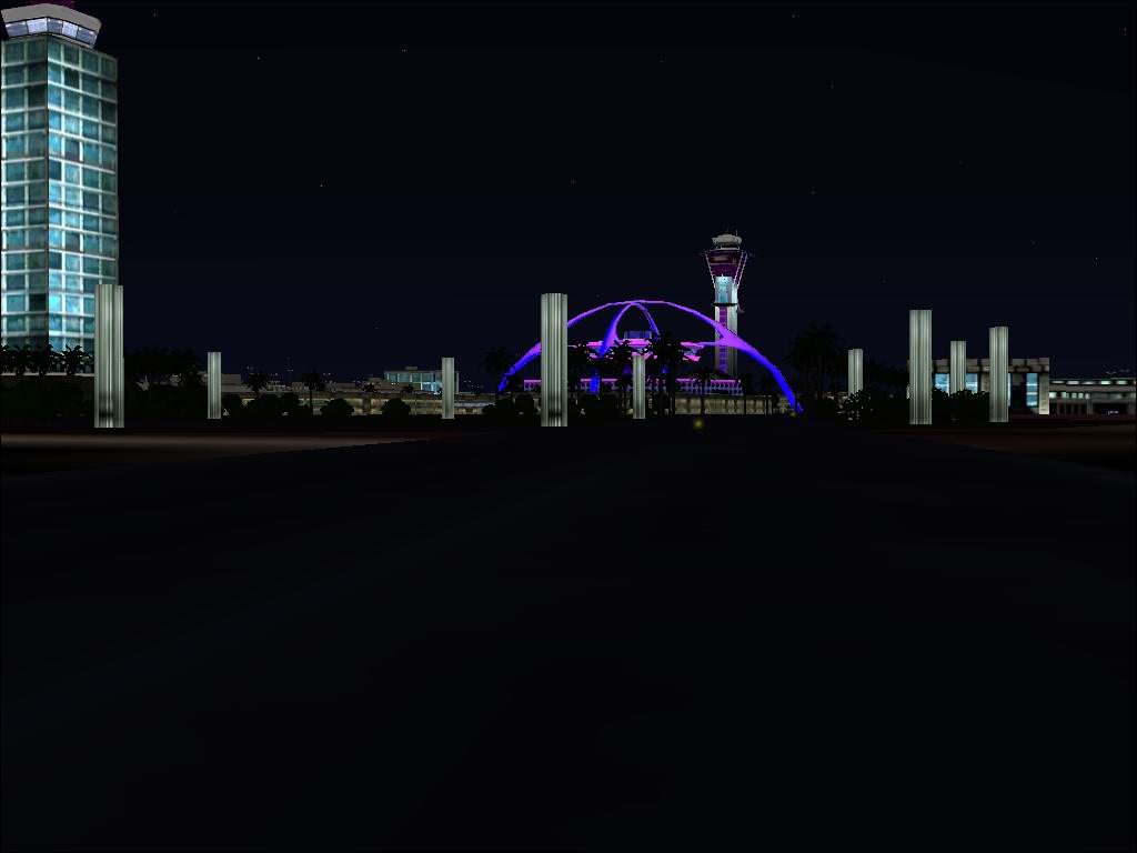Scenery for FS2002, Los Angeles International Airport 2002, By Bill Melichar A small scenery add on to the already magnificent Los Angeles International Airport that comes with FS 2002. This scenery adds the roadways approaching the airport, and going around the terminal area. It also adds on landscaping and the palm lined drives at LAX, and last but not least the lighted pylons at the entry to the airport. This is the airport I use the most, and have walked my dog around the entire terminal area while waiting for a flight to leave. Bill Melichar. 212K