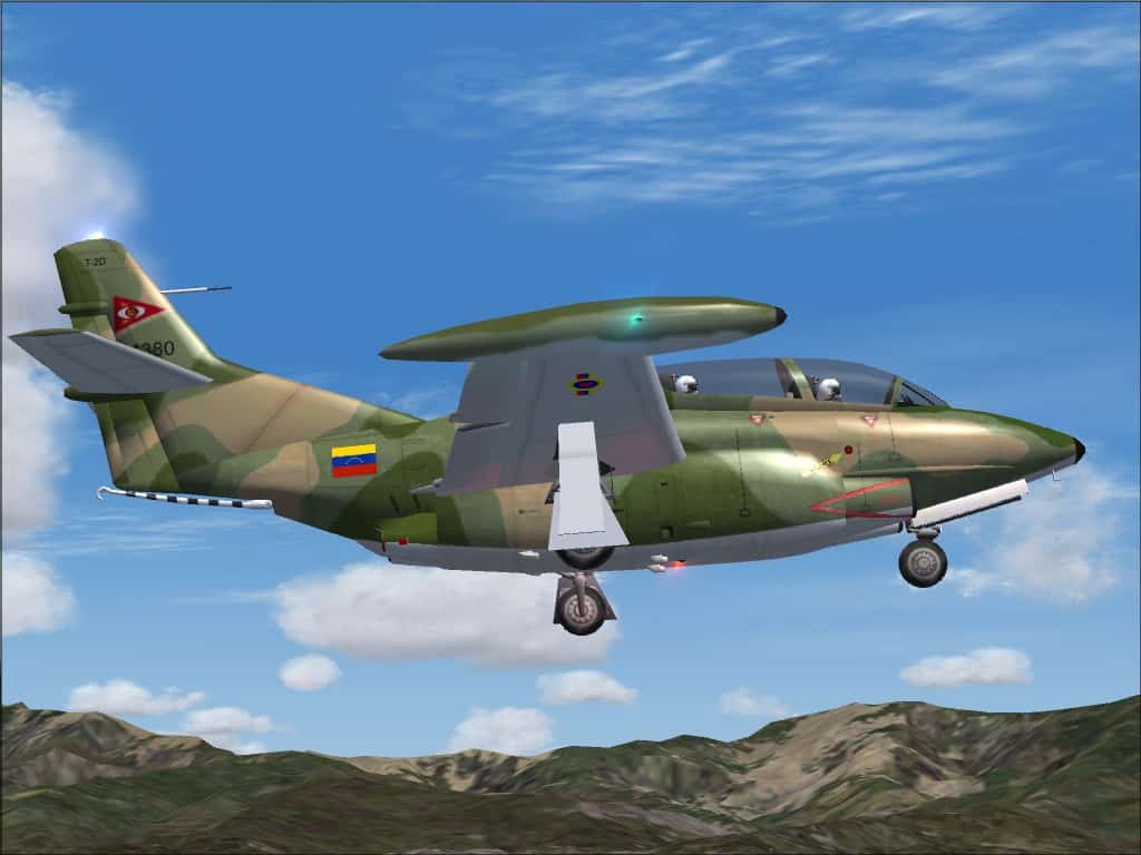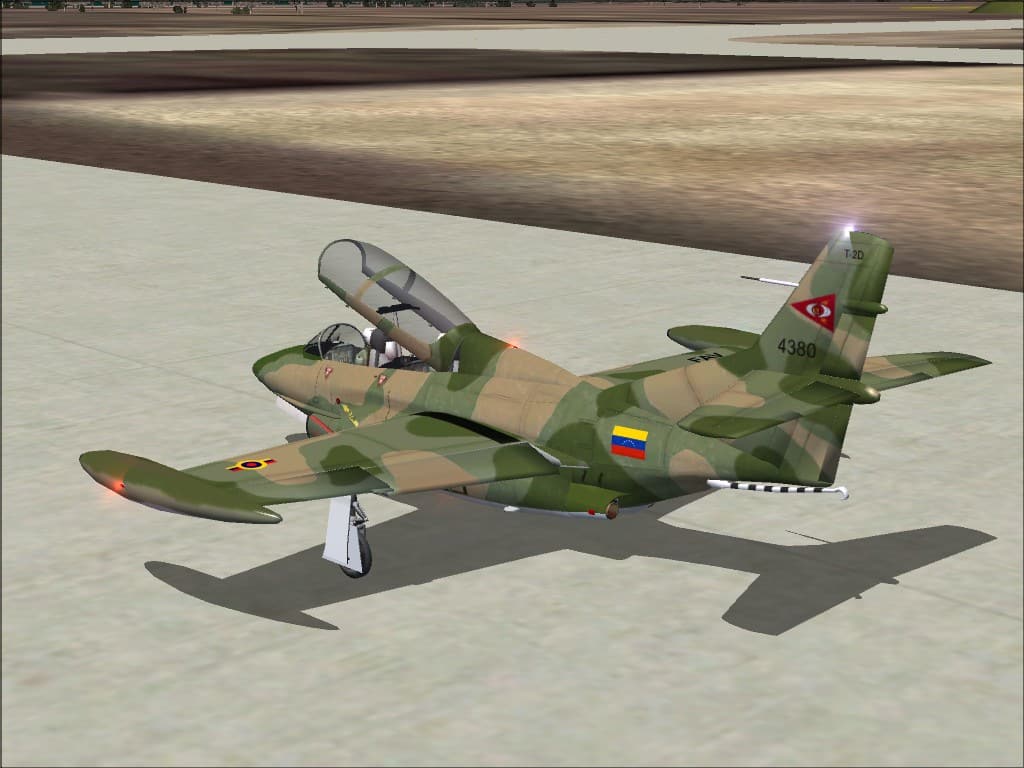 FS 2004 Fuerza Aerea Venezolana Rockwell T-2D Buckeye FAV 4380 Textures only. The Rockwell T-2D Buckeye was widely used in multi-roll operations, as advanced trainer in the FAV, at the Military Aviation School, (EAM), forming fighter pilots, for aerobatics team and finally as a combat fighter. This aircraft were in the FAV from 1972 untill 2000, when it were retired from service. This aircraft 4380 was a part of the Fighter Squadron N°35,Fighter Air Group N° 12. Its base was in Lt.Vicente Landaeta Air Base,Barquisimeto, Lara State, in 1993. Original model and master textures by Kazunori Ito. Original camouflage pattern (GAF) by Leonidas Theofilopoulos. Requires model file t2c_342.zip and t2cpanel.zip by Kazunori Ito (here). By Juan Ernesto Oropeza. 1.1MB