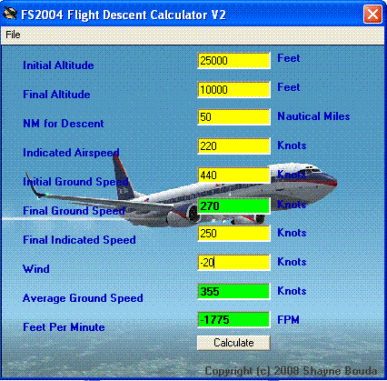 FS2000-FS2004 Descent Calculator Version 2 Simple calculator to find the rate of decent to a to start descending. By Shayne Bouda. 1.5MB