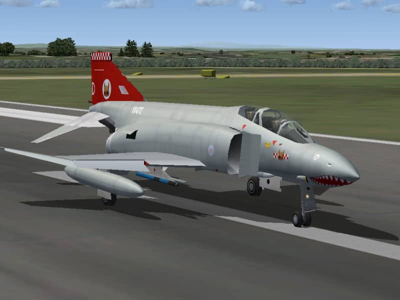 FS2002 / FS2004 AI F-4 Phantom FGR Mk2 AGNT Repaint Pack #3, 12 Textures. 41 and 54 Squadron each have 2 textures, 56 Sqn has 4 textures (Std Cammo, Std Grey, Grey with Red Fin. Grey With Red Fin and Teeth nose art.), 43 Sqn had 6 textures (Std Cammo (2 colour roundels, and 3 colour), Cammo with Check Pattern Rudder, Std Grey, Grey with Check Pattern fin bars, Grey with full fin check pattern). Original model (F-4M Phantom – FGR Mk.2) and textures by Fernando Martinez (required here). Repaints by Andy Nott of AGN Textures. 3.1MB