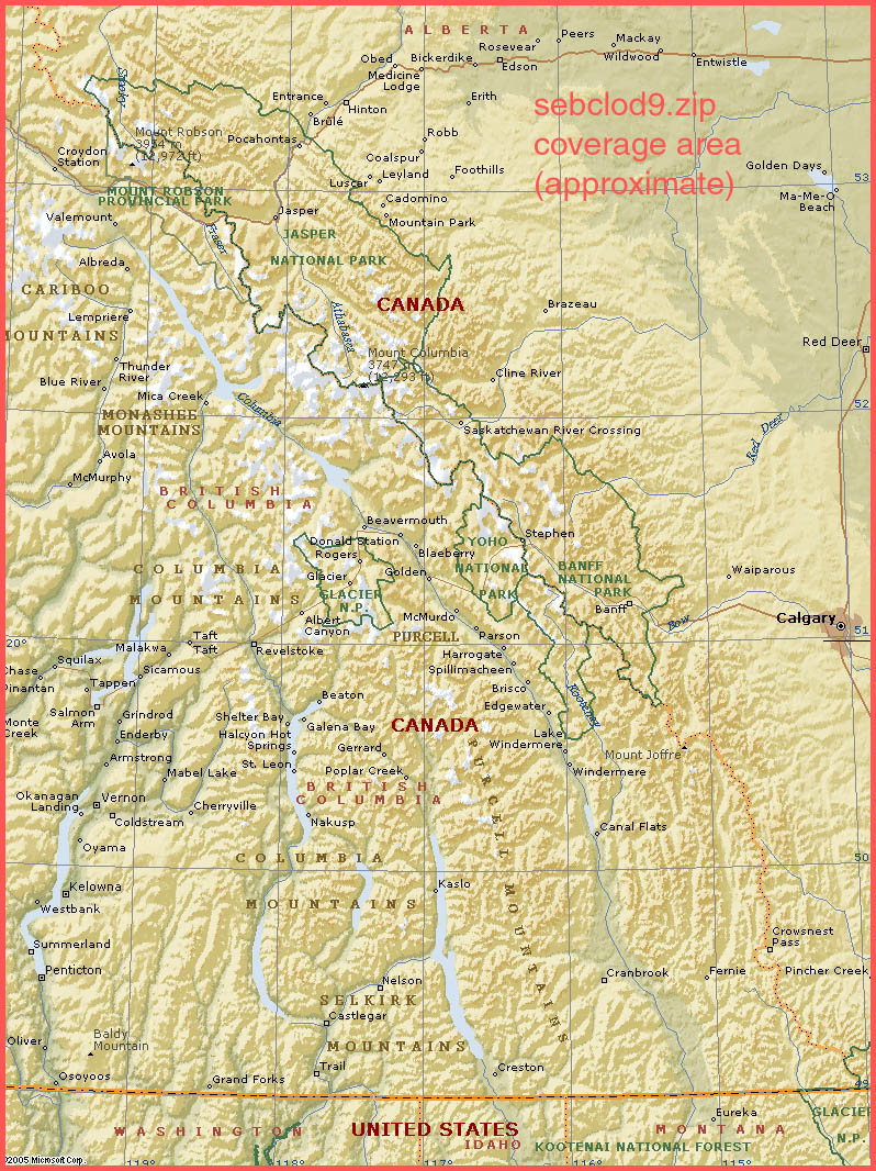FS2002/2004 Canadian Rockies Terrain Mesh. A new version of my terrain mesh files of southeastern British Columbia and south- western Alberta. N48*30′ to N53*26′ and W113*30′ to W120*. These files are based on the latest version of the GeoBase CDED1 source data and have been compiled at LOD9 (~76-m resolution). Also included are LOD8 (~153m) and LOD7 (~306m) files to prevent “texture tearing”. By Holger Sandmann. 55MB