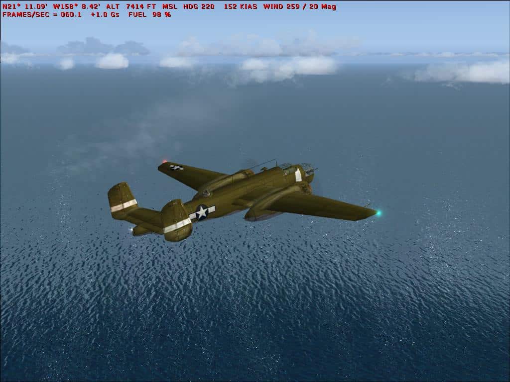 FS2004 B-25D Mitchell CFS2 default updated. This is the second update of the ai B-25D Mitchell from CFS2. I have redone the flight dynamics, and adjusted the contact points as necessary. The sound is aliased to the Ford Trimotor and the panel is aliased to the Beech Barron. Bob Chicilo. 1.5MB