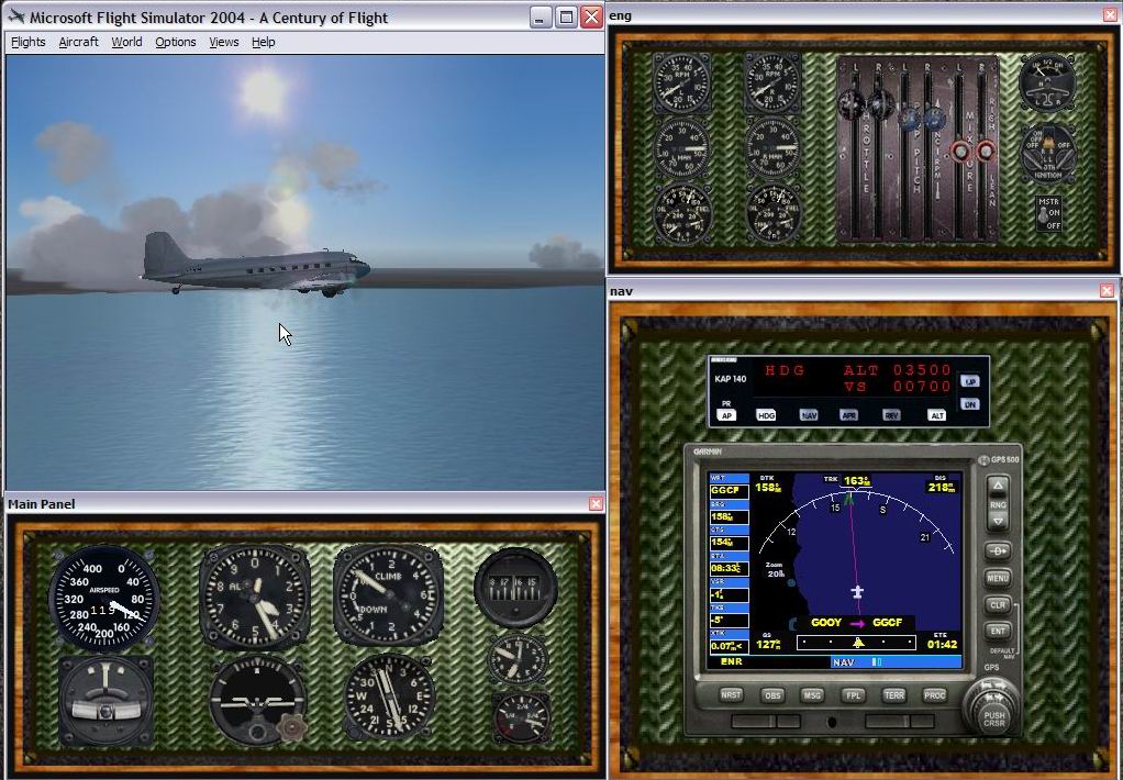 FS2004 ‘Boiler Panel’ I remember a flight simulator on a sinclair computer 30 years ago and it was all about flying.The cockpit was a black and white stripe at the bottom of the screen and it was fantastic.In response to the danger of fs becoming a cockpit simulator which makes flying impossible I made the boiler room .Used it to fly around africa in a dc 3 and it gave me time to enjoy the scenery on long flights .Gauges are the old p38f_lightning.gau should be stock.Nice to fly at night,I use it for all twin vintages. By A. Fulton. 511K