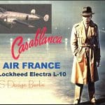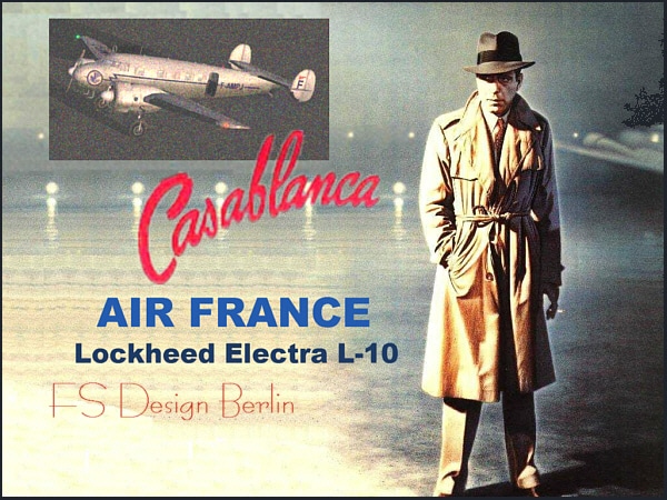 FS2004 Casablanca Air FranceLockheed L-10A Electra, registration F-AMPJ. We know Air France never used the Electra, but in the legendary movie CASABLANCA with Humphrey Bogart and Ingrid Bergman the Electra had a fascinating movie part in the outfit of Air France. This is an update (version 2) of the FSDS2/FS2004 Electra L-10 from FS-Design Berlin with improved shiny effects and some bug fixes. Livery repaint by Dale DeLUCA; improved model by Arik Hohmeyer (FS-Design Berlin). 8.6MB