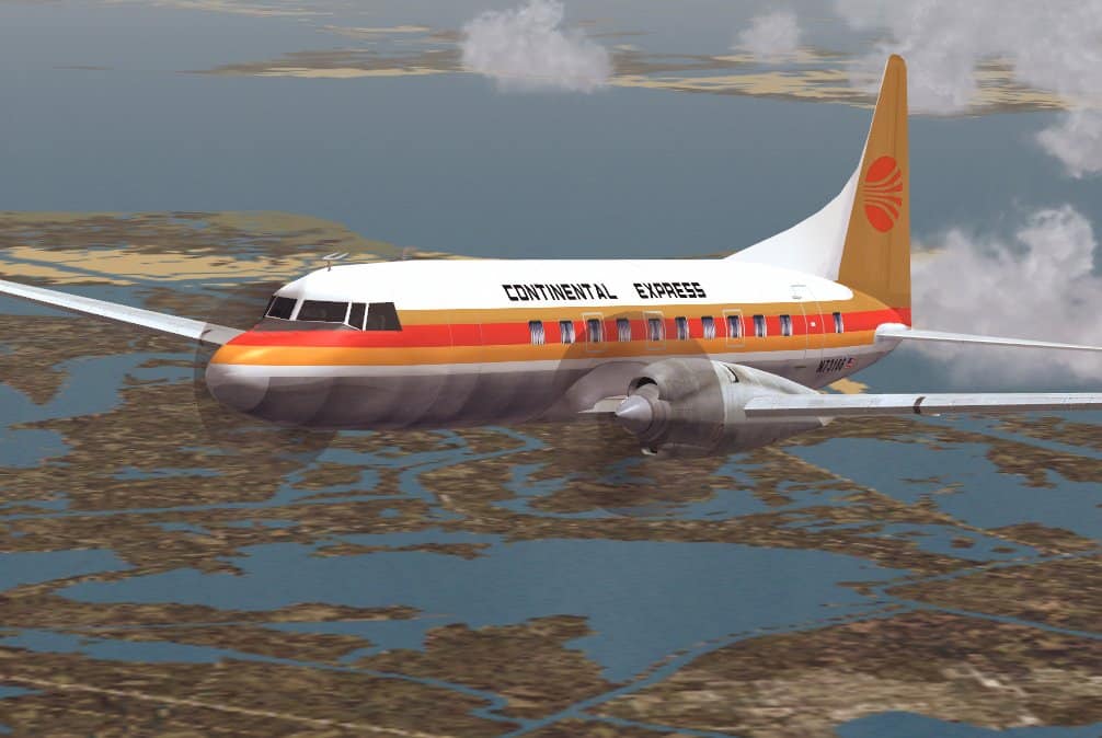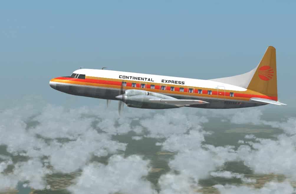 FS2004 Continental Express Convair 580 Textures only DXT3 textures for Greg Peppers CV-580 in Continental Express livery. When Continental Airlines bought out Frontier Airlines,they were to put the CV-580s into service under the Continental Express banner for short haul routes.But only 2 CV-580s ever got painted and sadly they never got to see revenue service with Continental.Most of the old Frontier 580’s are stll flying today with various companies,but at long last are nearing the end of their useful lives and are being stored and scrapped.This is my rendition of N73166,of which was the only CV-580 to ever wear the full Continental colors.You will neeed the base package,its the Sierra Pacific CV-580 package. Special Thanks to Photographer Jim Newton for shooting the picture his historic plane and providing the additional Aircraft data needed to complete this paint.Repaint copyright: Joe DeGregorio. 2.4MB