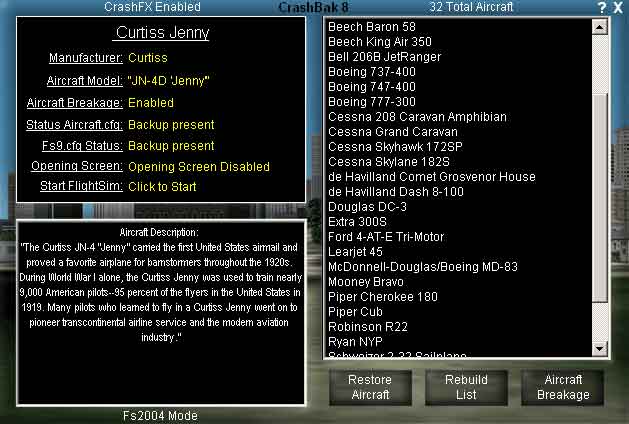 FS2004 Crashback Version 8 : 07/23/04 *DEMO* $9.99 to purchase Free update for registered users. NEW FEATURES1. NEW! More customizable crash effects. 2. NEW! Choose Small or Large aircraft w/18 or 44 different effects. 3. NEW! High speed search function when changing Fs2k2/4 modes. 4. NEW! High speed List loading for folks with lots of aircraft. Grant Bovee. 2.8MB