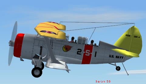 FS2004 Curtiss SBC-4 Helldiver This FSDSv2 project is painted for VS-2 assigned to the Pre War USS Lexington. It features moving parts, including an accurate Curtiss gear retraction cycle, dive brakes, crew figures, specular color shine and transparent windows. The vintage style panel uses default gauges and it is optionally configured for a carrier catapult launch and arrestor gear landings. By Paul Clawson. 466K