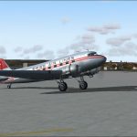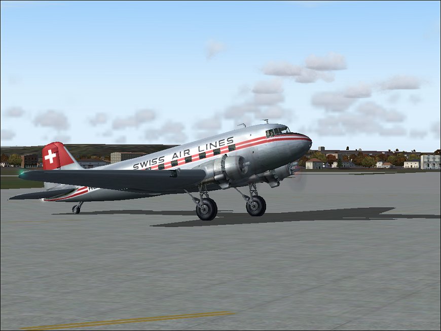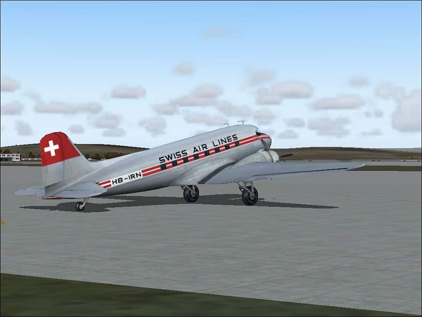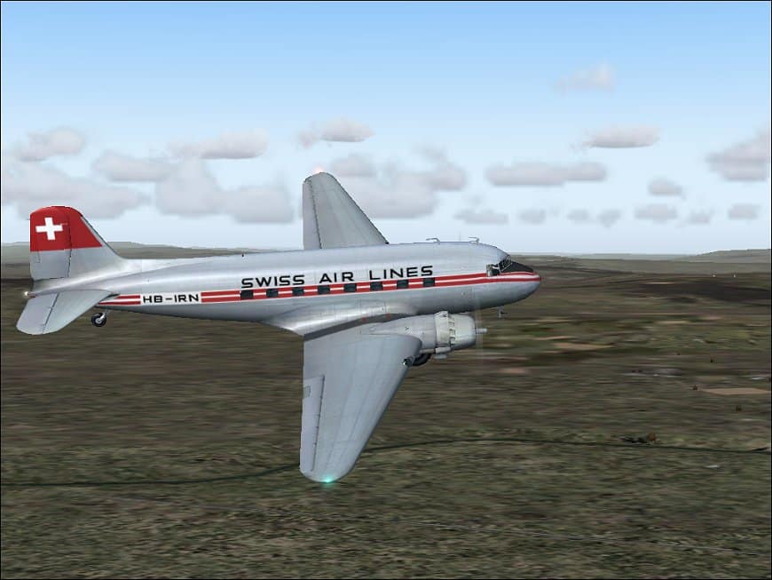 FS2004 DC-3 in SWISS AIR LINES livery . This default aircraft repaint shows HB-IRN, one of the last SWISS AIR LINES DC-3s. she can be seen in her 1960’s livery: red and white striping on all aluminium fuselage. Thank you Mark “Dark Moment” Beaumont, for the splendid FS2004 Douglas_DC-3 Repaint Templates you have provided. By Jaap de Baare. 2.1MB