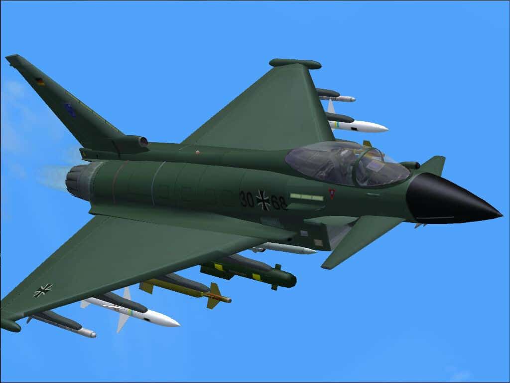 FS2004 Eurofighter Typhoon Germany Bundeswehr 30+68, station in Lechfeld, Tornado look, for FS2004 in 5 Weaponequipments : trainer – light (Note: Lite version with limited detail and without virtual cockpit) Eurofighter is a single-seat, twin-engine, agile combat aircraft which will be used in the air-to-air, air-to-ground and tactical reconnaissance roles. The design of Eurofighter Typhoon is optimised for air dominance performance with high instantaneous and sustained turn rates, and specific excess power. Special emphasis has been placed on low wing loading, high thrust to weight ratio, excellent all round vision and carefree handling. The use of Stealth technology is incorporated throughout the aircraft’s basic design. The new AFS – Eurofighter has flightdynamics of real Eurofighter. This has a new panel with new gauges and a new high textures virtual cockpit. Model, panel, sounds, textures and gauges – Author: A.Meyer. 8.5MB