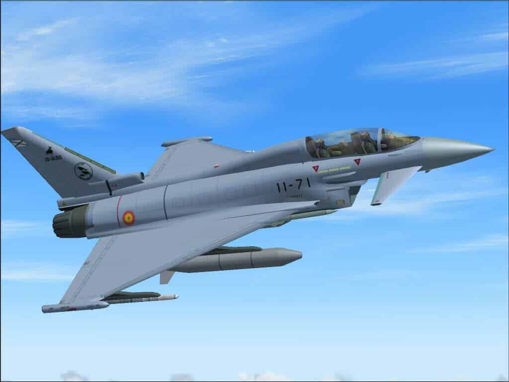 FS2004 Eurofighter Typhoon Spany, – with model update. Two seater (INFO: Freeware version: low detail and without virtual cockpit) Eurofighter is a single-seat, twin-engine, agile combat aircraft which will be used in the air-to-air, air-to-ground and tactical reconnaissance roles. The design of Eurofighter Typhoon is optimised for air dominance performance with high instantaneous and sustained turn rates, and specific excess power. Special emphasis has been placed on low wing loading, high thrust to weight ratio, excellent all round vision and carefree handling. The use of Stealth technology is incorporated throughout the aircraft’s basic design. The new AFS – Eurofighter has flightdynamics of real Eurofighter. This has a new panel with new gauges and a new high textures virtual cockpit. Model, panel, sounds, textures and gauges – Author: A.Meyer. 8MB